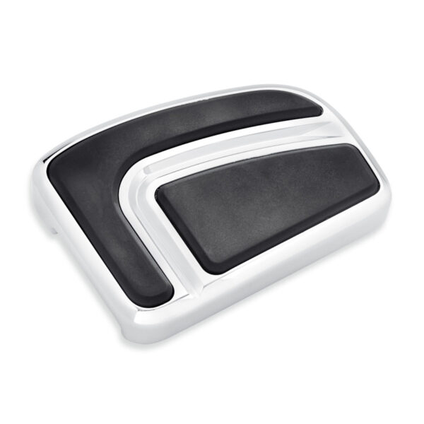 Presenta un cromo curvo que rodea una almohadilla de goma de color negro intenso, acentuada con una ranura central profunda.