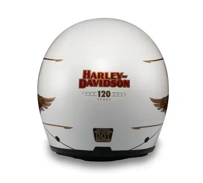 Celebre los 120 años de Harley-Davidson. Peso promedio: 1150 gramos. Calota de fibra de vidrio preimpregnada. Correa de barbilla con doble anilla en D y cubierta de cuero artificial. Forro extraíble, lavable y con costuras de lujo que absorbe la humedad. Parasol retráctil con 95 % de protección UVA/UVB y revestimiento antirayaduras en ambos lados. Certificado según la norma de seguridad DOT FMVSS 218.