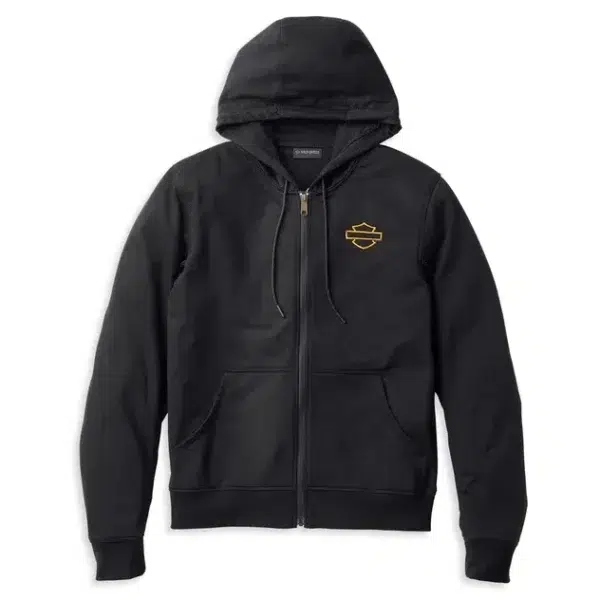 Confeccionada con un corte resistente de piel de vacuno, la capucha extraíble está hecha de una mezcla de algodón y poliéster de felpa francesa para uso diario. Su funcionalidad se refleja en la espalda elástica, las mangas precurvadas y los bolsillos protectores (además de otras características que se detallan en las especificaciones a continuación). Úsala sola, con la sudadera o con la sudadera por separado. Ojales en axilas y mangas para una ventilación pasiva. Laterales con cremallera de liberación. Hecha 100 % de piel de vacuno con una capucha de felpa francesa compuesta por 60 % algodón y 40 % poliéster. Cremallera frontal de doble sentido. Bolsillos calientamanos y bolsillos en el pecho con cremallera. Solapa con cierre a presión y bolsillos en las mangas con cremallera. Un bolsillo interior oculto y un bolsillo interior con cremallera. Bolsillos protectores en hombros, codos y espalda. Cuello y puños de punto acanalado. Sudadera con capucha extraíble con bolsillos tipo canguro, capucha forrada en jersey, cremallera frontal y puños y cintura de punto acanalado. Parche bordado de Harley-Davidson® y bordado directo de Bar & Shield en la sudadera.