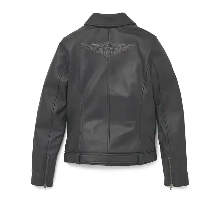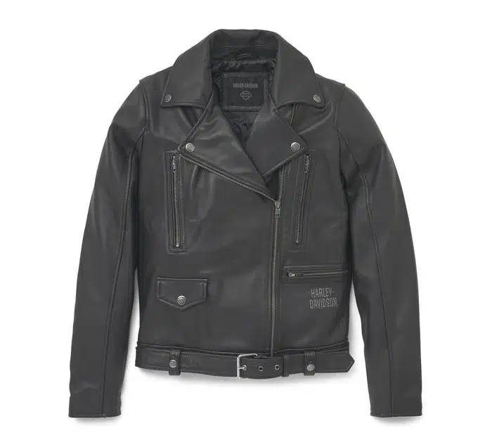 Bautizada con el nombre de nuestra histórica dirección, la chaqueta de cuero Juneau combina el estilo motero por excelencia con el orgullo HD®. Su corte corto está confeccionado en suave piel de cordero con un resistente forro de sarga de poliéster. Cuenta con numerosos bolsillos, cinturón ajustable y un resistente cuello con cierre a presión. Acércate para ver cómo las costuras, broches, remaches y cierres se complementan con nuestra marca bordada para crear un look de cuero que atraerá todas las miradas.