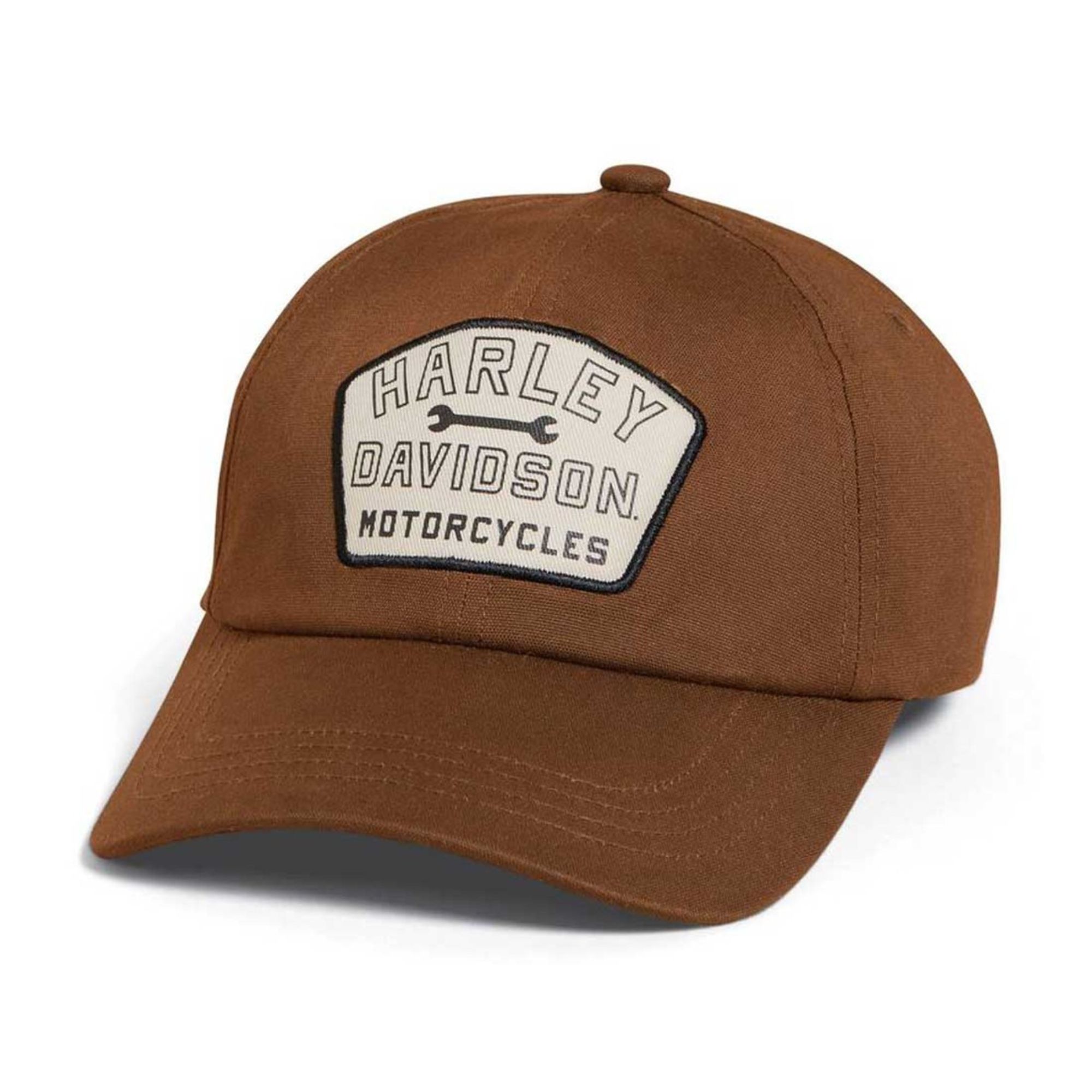 Gorra de béisbol H-D de lona encerada para hombre – Marrón Dachshund. Hecha con 97 % algodón y 3 % elastano. Confeccionada con un corte de lona de algodón encerado y elastano resistente e impermeable, esta gorra es ideal para cualquier excursión al aire libre. Corte elástico. Parche de sarga estampado.