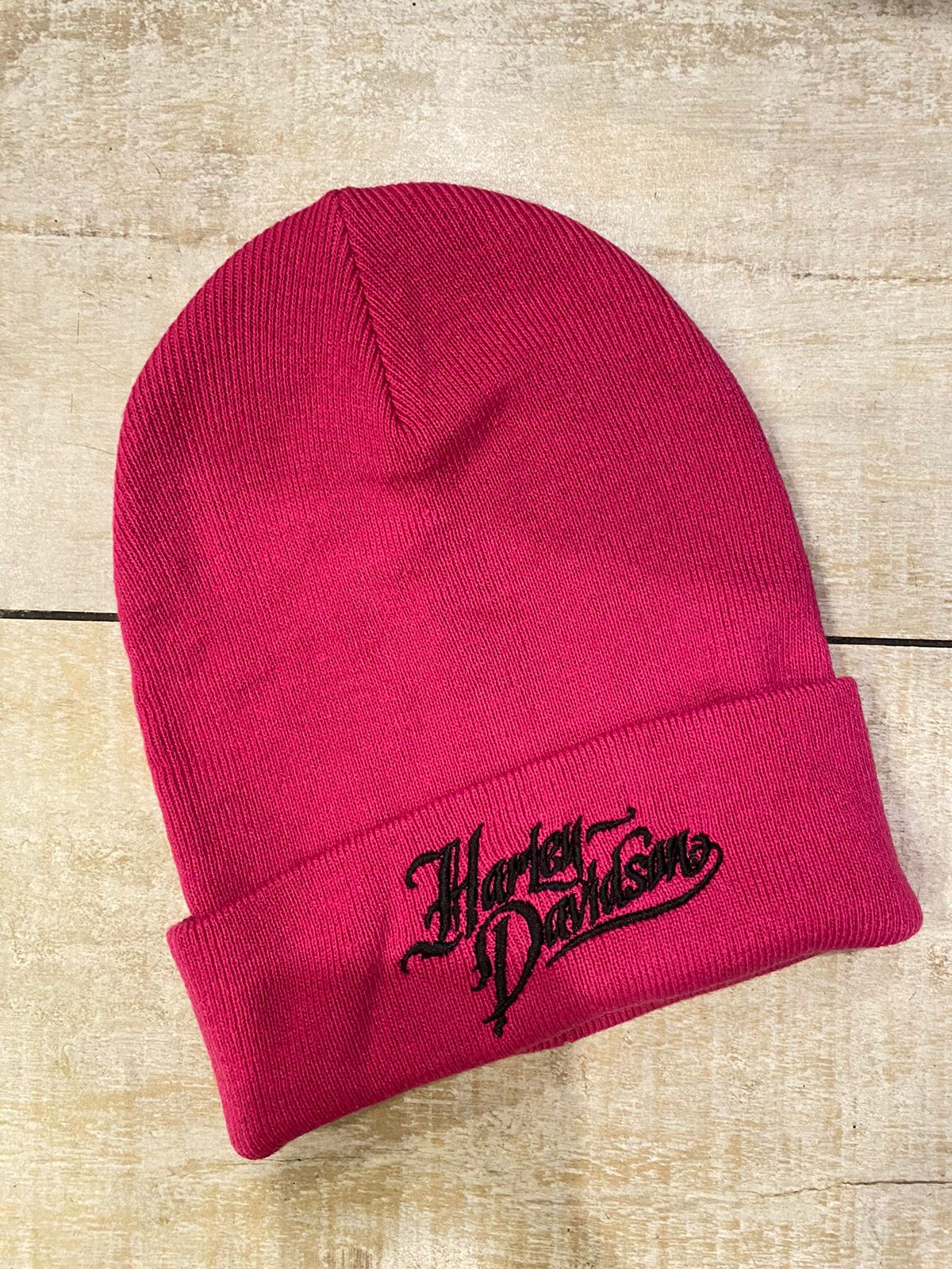 Gorro con puños HD Script para mujer – Rosa brillante. Cómodo y suave gorro con puños de 7,6 cm. Hecho de acrílico 100 % resistente y elástico. Preciosa inscripción HD bordada en la parte delantera. El nombre de nuestro concesionario Harley de Wisconsin con costuras negras en la parte trasera. Gorro de alta calidad y súper cómodo, perfecto para cualquier entusiasta de Harley. ¡Luce tu pasión por las motos todo el invierno!